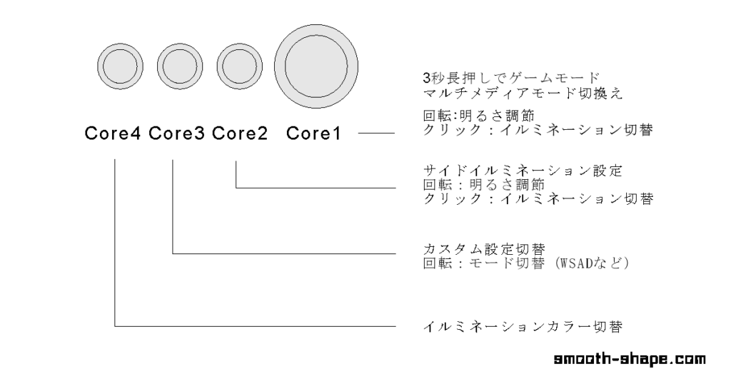 The AULA L2098 features four Core dials (multi-function knobs) that allow you to switch modes and customize illumination.