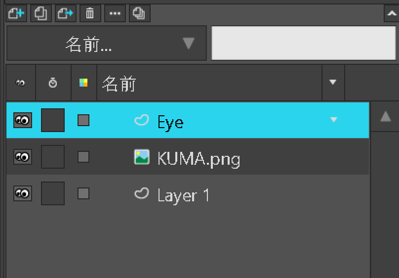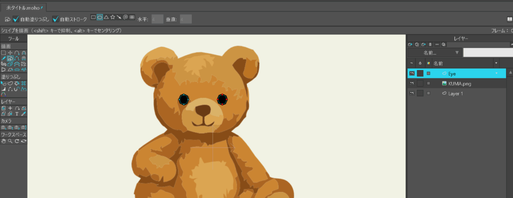 レイヤー構成は、目 → クマ → レイヤー1(初期生成されるレイヤー) の順です。クマの上に目のレイヤーが来るように配置してください。