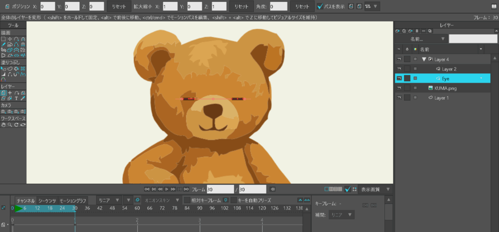 次に30フレーム目に移動し、レイヤーの変形ツールを使って「目を閉じた状態」にします。(ベクターデータの場合、中間のアニメーションは自動的に補間されます)
