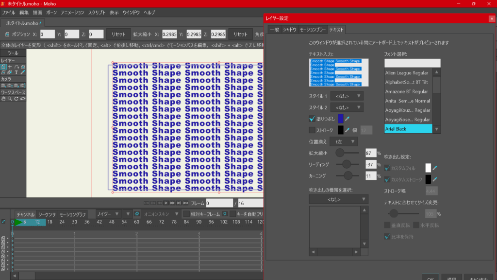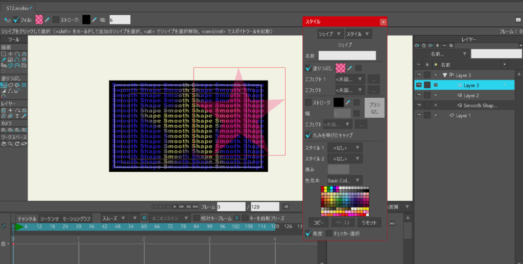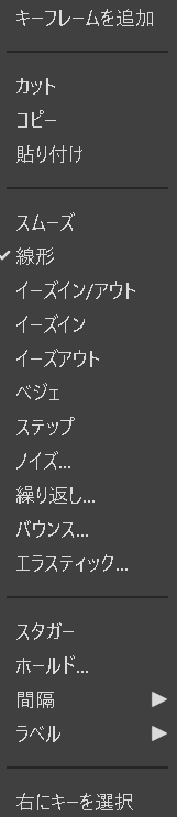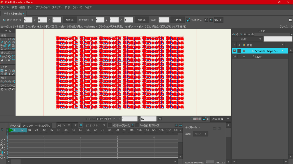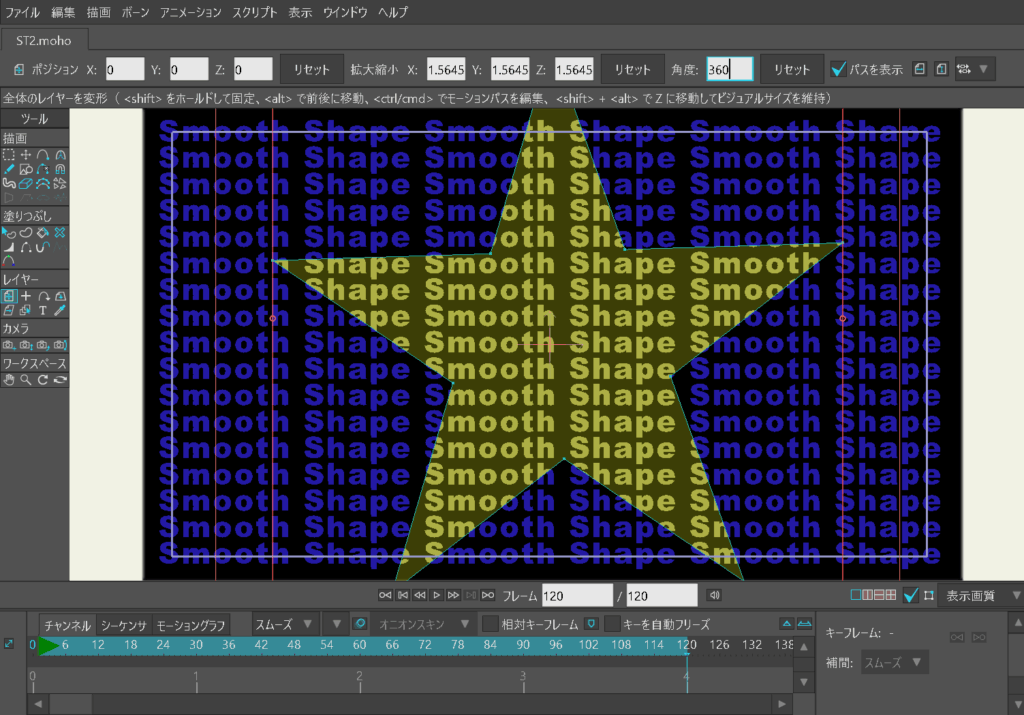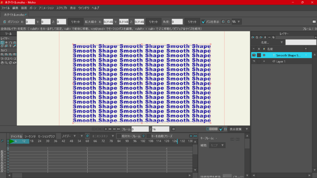 MOHOではキーフレームを作成すると、動きが滑らかになるように「スムーズ」設定されます。
