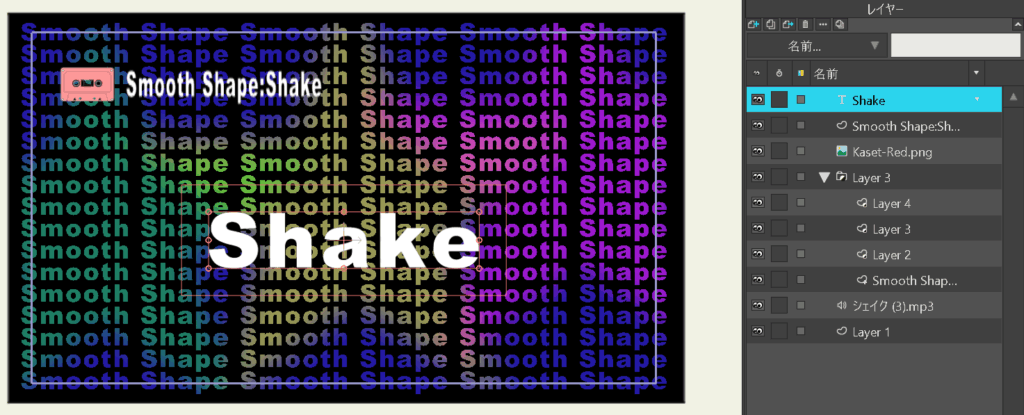 レイヤーの順序は、「Shake」テキストレイヤー、「SmoothShape]テキストレイヤー、「カセットテープ(PNG)」イメージレイヤー、グループレイヤー(星とテキストマスクが入っているレイヤー)、背景(黒い矩形)