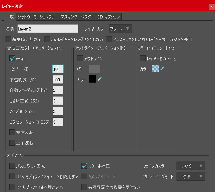 レイヤー設定の「ぼかし半径」を 20~30 程度にすると、境界が柔らかくなり光っぽさを演出できます。