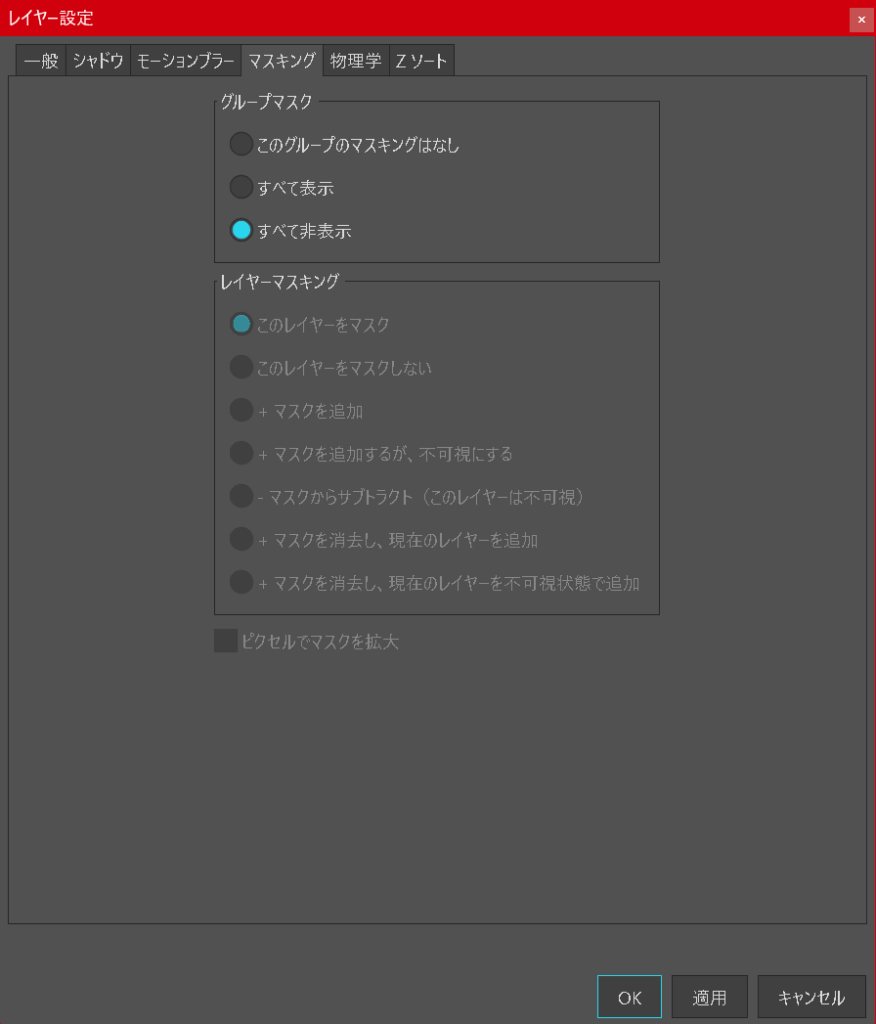 グループフォルダをダブルクリック → マスキングタブ → すべて非表示 にチェックを入れます。