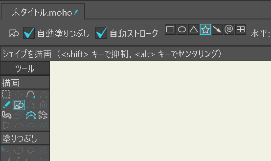 MOHOには「シェイプを作成」ツールがあり、星形や楕円、四角形などをすぐに配置できます。