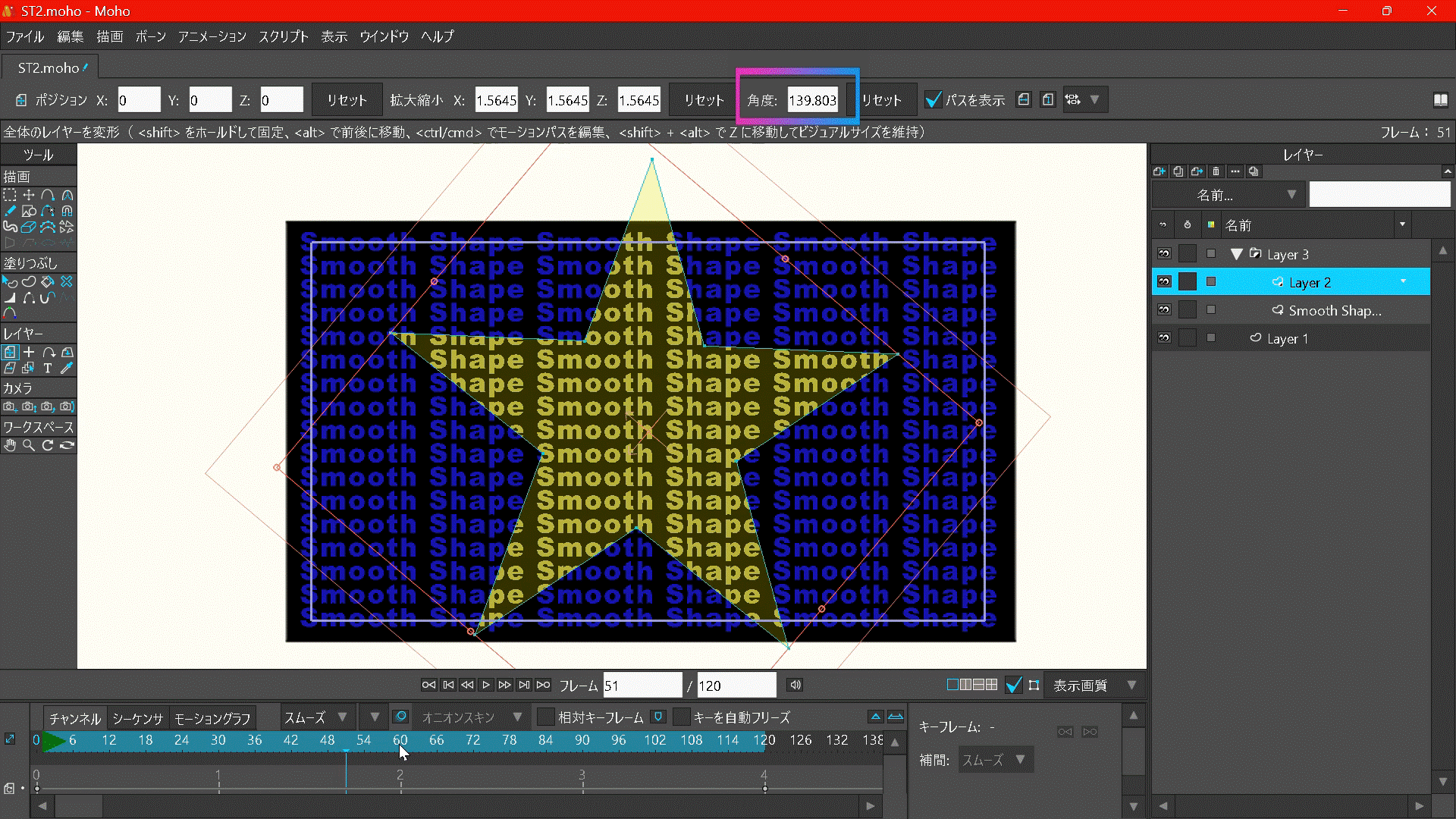 フレームの選択や移動は、タイムライン上でマウスクリックまたはドラッグします。レイヤーの角度を入力するには、画面上の「角度」から数値を入力します。(マウス操作でも移動、拡大縮小、回転が可能です)