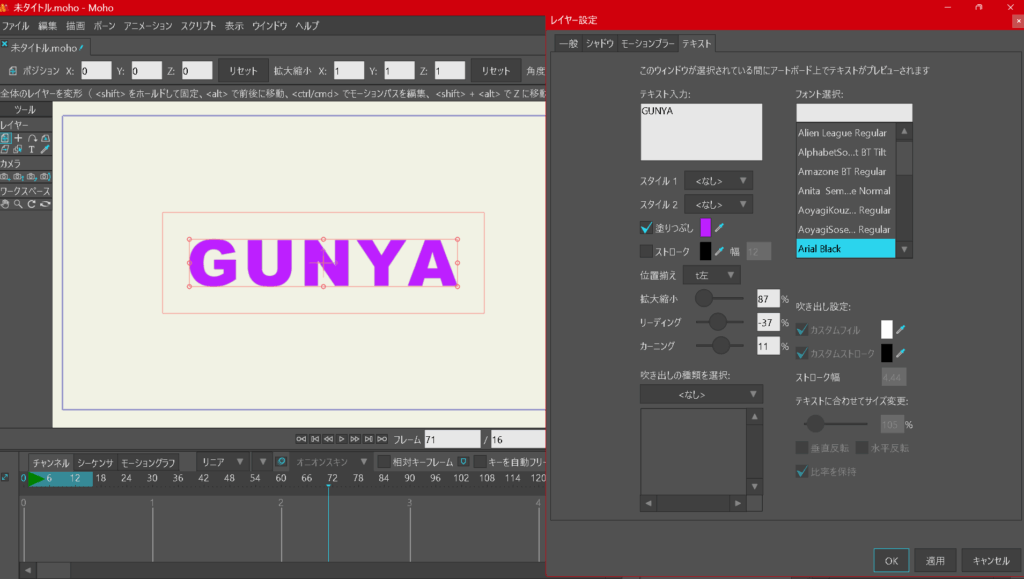 歌詞や見出しなど揺らしたい文字を入力。フォント/サイズ/塗り/ストロークを設定しOKを押します。
